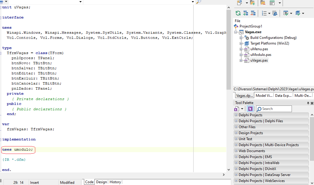 Pressione a tecla F12. Após implementation, digite: uses umodulo.