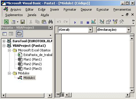 Para acessar o editor de Visual Basic for Applications: Menu Ferramentas/ Macro / Editor do Visual Basic ou Alt + F11. Será aberta a janela abaixo:
