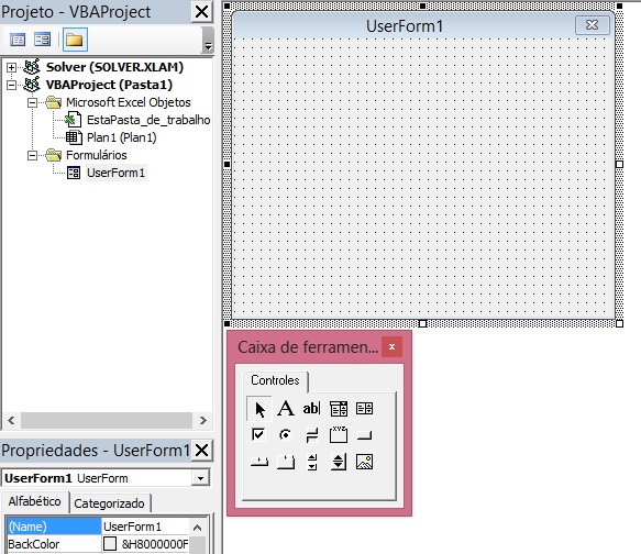 Na janela Project Explorer conforme figura acima, aparece a pasta UserForm1 cm formulário UserForm1.
